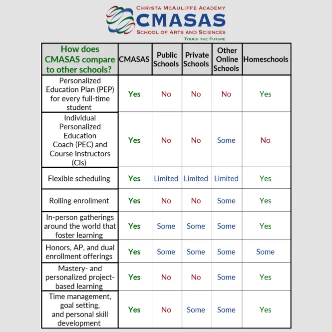 Traditional public schools, private institutions, online academies, and homeschooling each come with their own set of strengths and limitations. However, at CMASAS, education isn't a one-size-fits-all endeavor. Instead, it's a personalized journey crafted to meet the unique needs and aspirations of each student. Here's how: